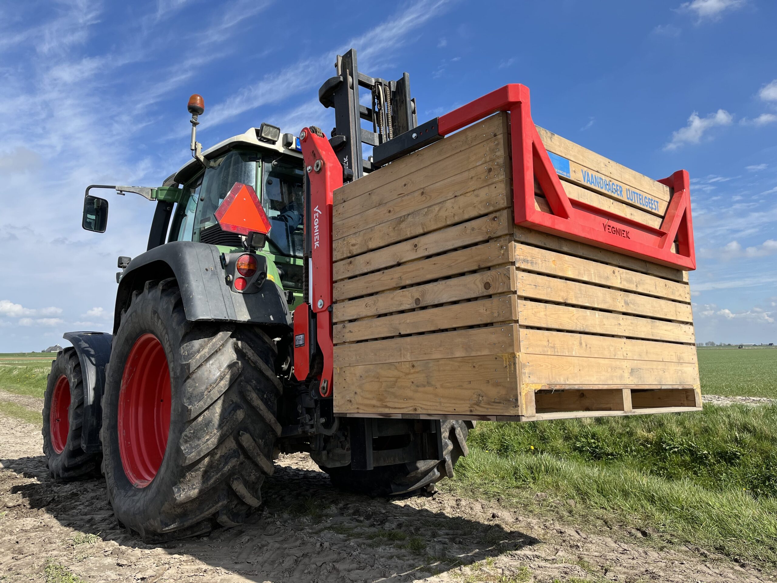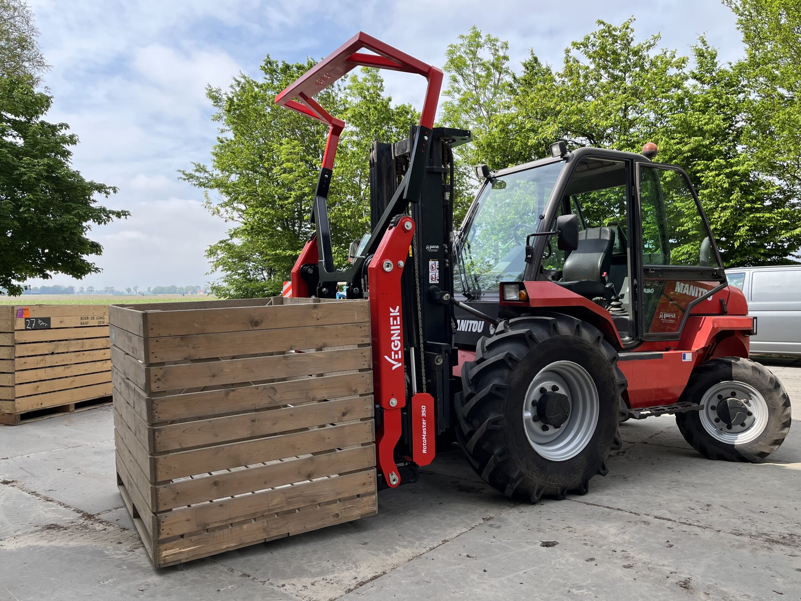 The Vegniek RotoMaster is the most robust and compact forward tipping box rotator on the market. By means of a quick lock system the rotator can be quickly and safely attached to a forklift truck, front loader, mast or telehandler. All functions can be operated effortlessly with just one double-acting hydraulic valve!